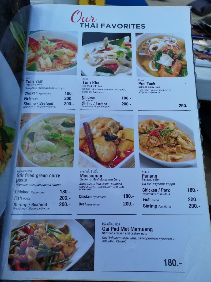 Expect a selection of vibrant flavors ranging from freshly grilled seafood like tiger prawns and BBQ lobster, to comforting Thai classics such as red curry and tom yam shrimp soup. Light bites like margherita pizza and Thai omelettes provide satisfying options at any time of day, whether you're stopping by for a casual lunch or a relaxed dinner by the waves.
